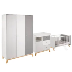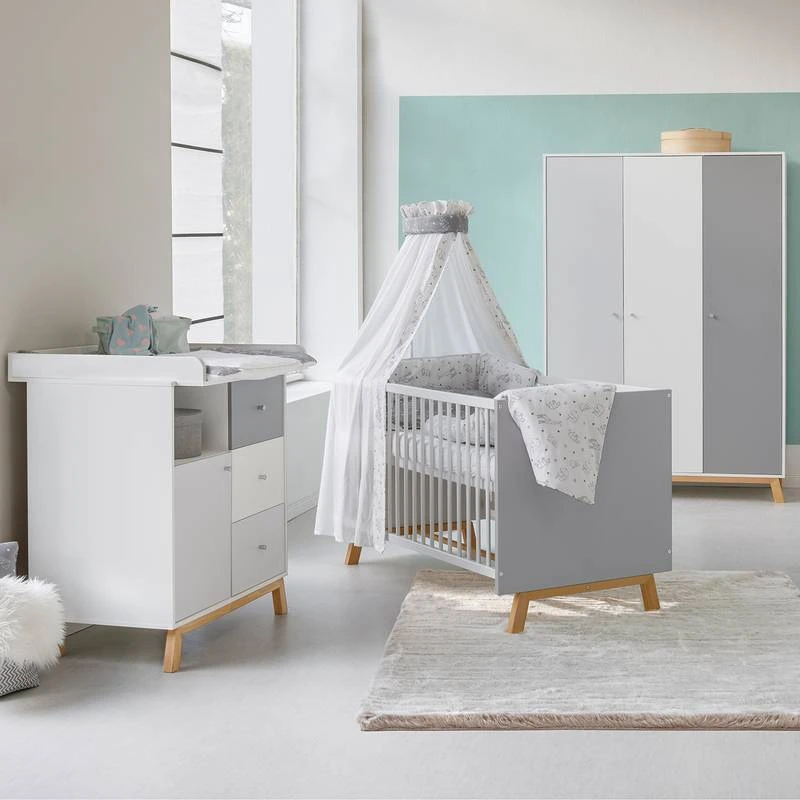 - Contenu de la livraison : Lit évolutif 70 x 140cm, pans de transformation, commode à langer avec table à langer amovible, armoire 3 portes