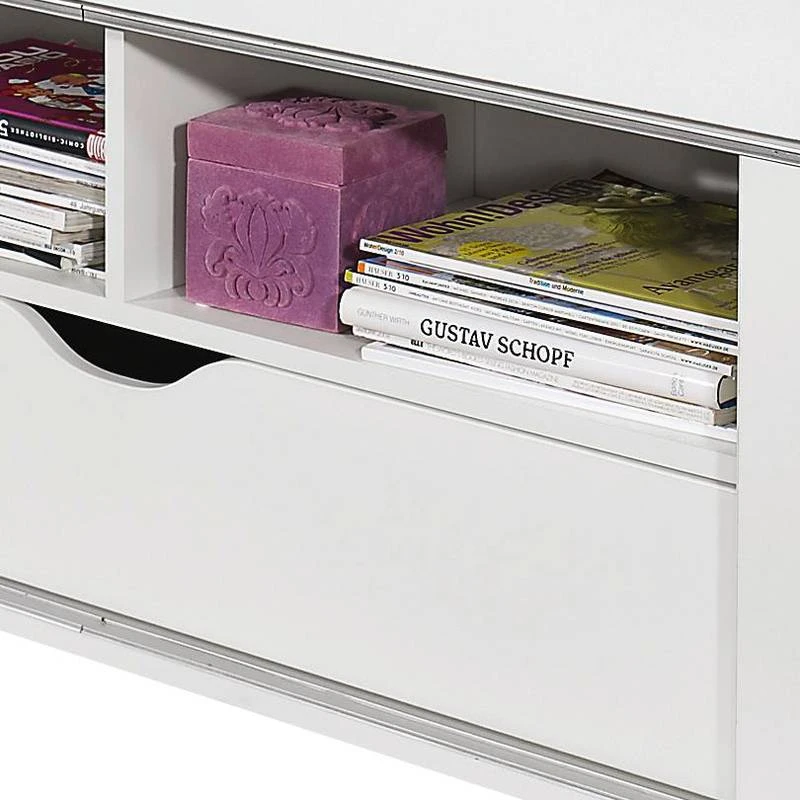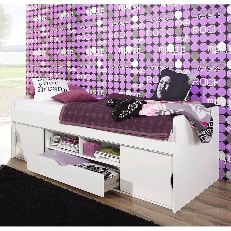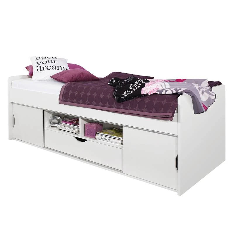 - Lit multi-rangements avec 2 portes coulissantes Ă gauche et Ă droite, 2 compartiments ouverts et 1 tiroir