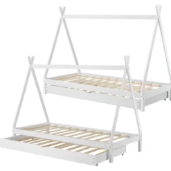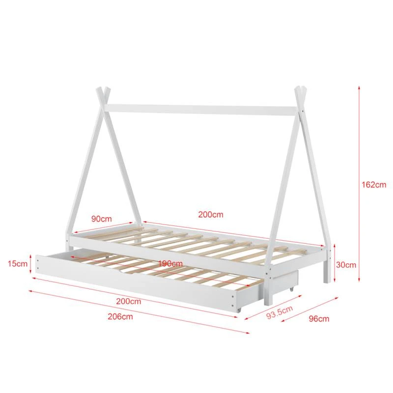 - Contenu de la livraison : 1 x Lit tipi pour enfants avec sommier Ă lattes – 1 x Lit d’appoint avec sommier Ă lattes