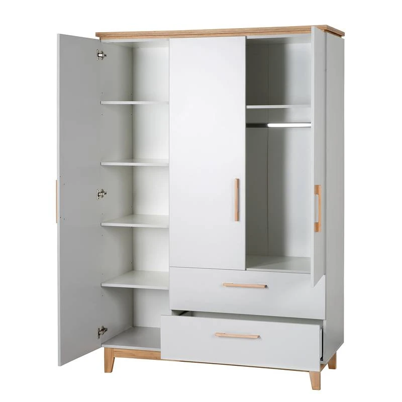 - Contenu de la livraison : Armoire 3 portes, 3 portes, 2 tiroirs Ă©troits, 1 tringle Ă vĂȘtements, 5 Ă©tagĂšres, HxLxP : 200×134,5x55cm