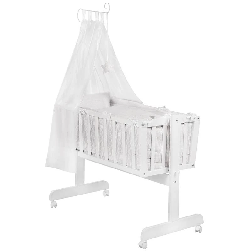 - Autres caractĂ©ristiques : Berceau complet, blanc verni, dimension : 90x40cm, avec barres plates, composĂ© d’un berceau, d’un matelas en polaire, d’un Ă©quipement de lit (housse de couette, taie d’oreiller, nid et ciel de lit), d’une barre de coutil et de baldaquin, avec fonction de berçage et bouton de sĂ©curitĂ©, avec roulettes Ă frein