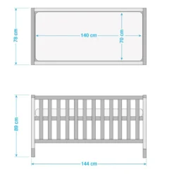 - Autres dimensions : Lit enfant évolutif : 89x144x78 ; commode à langer 104x117x78 ; armoire : 200 x134,5×55 (HxLxP en cm)