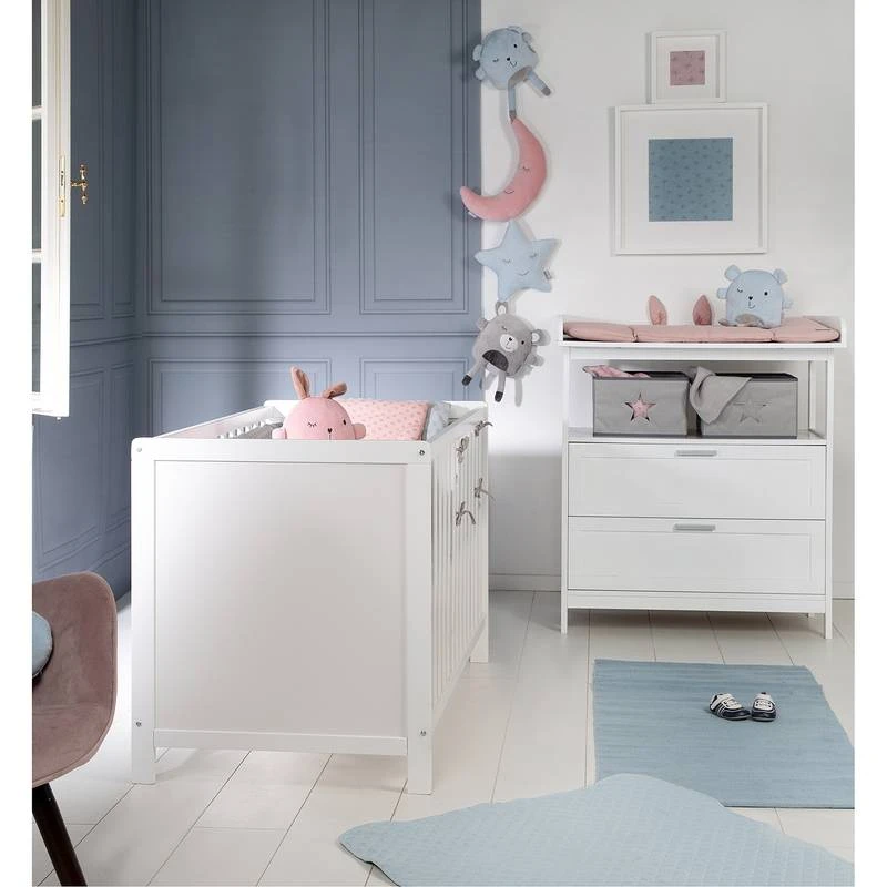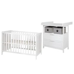 - Autres caractéristiques : Ensemble comprenant : – lit enfant, en bois laqué blanc, réglable en hauteur, 5 barreaux enfichables, HxLxP : 76x66x121,5cm, sommier à lattes, plan de couchage 60x120cm, – commode à langer « Hamburg » en blanc, y compris meuble à langer, 2 tiroirs, compartiment ouvert, HxL : 100×87 cm, profondeur avec/sans plan à langer : 75 /40 cm, hauteur du plan à langer 92 cm, avec 2 boîtes Canvas et fixations murales