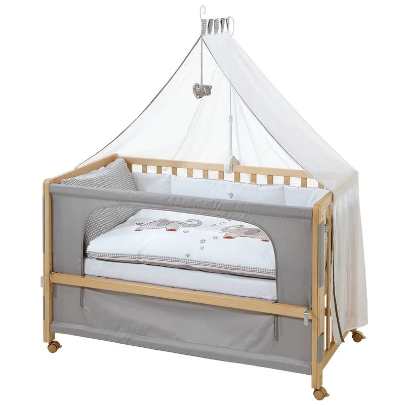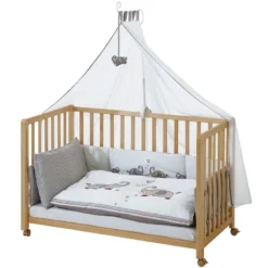 - Autres caractéristiques : Lit enfant, bois naturel, 60x120cm, réglable en hauteur avec partie latérale en tissu à ouvrir, peut être fixé au lit des parents à la hauteur appropriée. Avec matelas, nid, baldaquin, perche à baldaquin et linge de lit, avec un élément de jeu, avec une barrière latérale supplémentaire (sans barres de glissement). Roulettes pourvues de frein. Peut être utilisé comme lit d’appoint, lit d’enfant et lit junior.